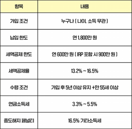 - 세액공제: 연 600만 원 한도 내에서 납입액의 13.2~16.5%를 세액공제받음