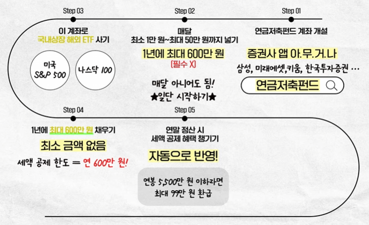 저는 연봉 5,500만 원 이하 구간에 해당하는데, 만약 1년에 600만 원을 꾸준히 채운다면 연말정산 때 최대 99만 원을 환급받을 수 있습니다. 물론 지금은 ISA에 투자 비중을 더 두고 있어서 연금저축펀드에 매달 50만 원씩 넣기는 어렵습니다. 하지만 월 만 원이나 10만 원 같은 소액이라도 시작해 두면, 나중에 여유가 생겼을 때 금액을 늘리기가 훨씬 수월합니다.